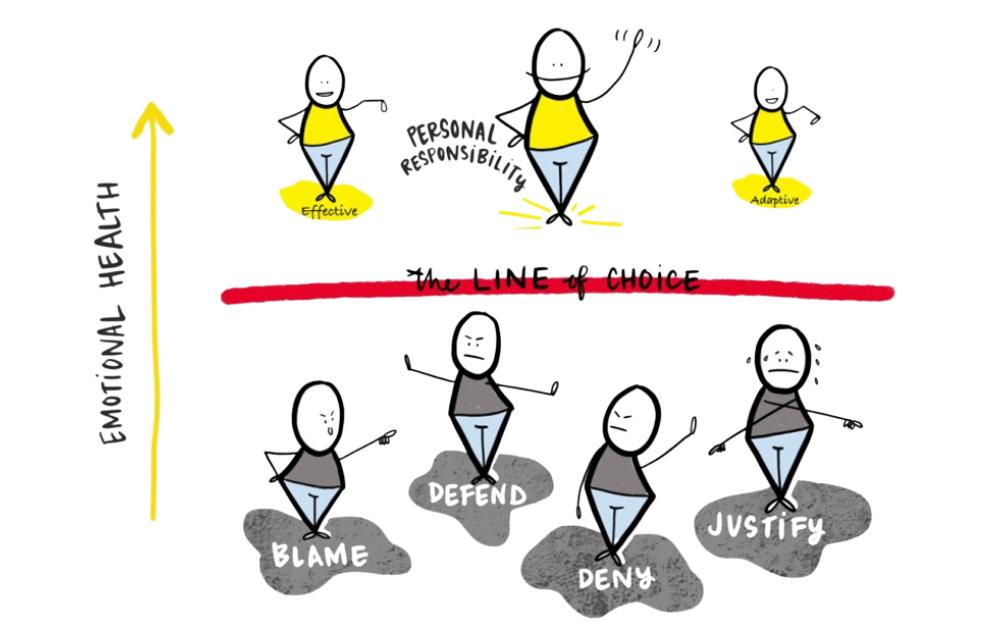 Genuine harmony requires personal responsibility for the way we show up. In our work, we draw a line of choice between automated responses: blaming, defending, denying, justifying and the more emotionally healthy option of a thoughtful, constructive, adaptive and effective response. Above the line sits personal responsibility: not for everything that happens to us, but for how we choose to respond. Every moment we choose above the line is a small act of peace-making, with ourselves and with the world.